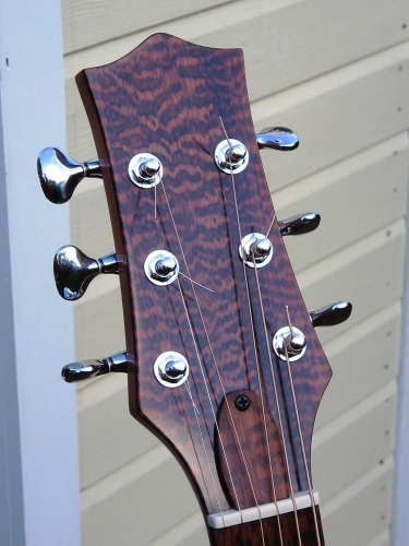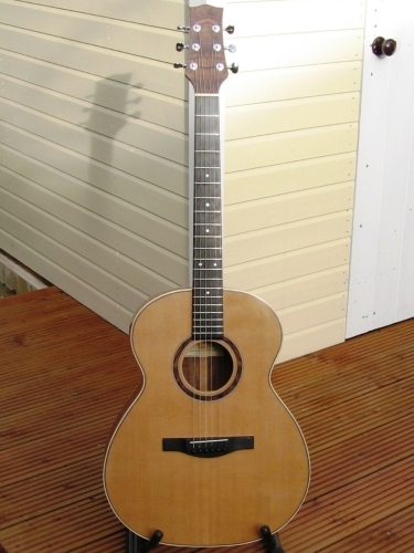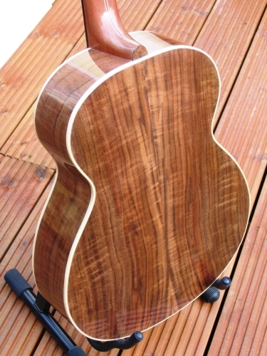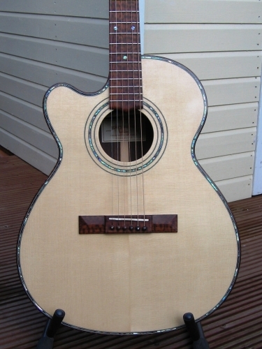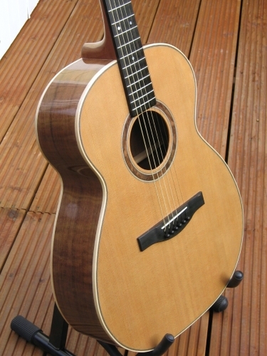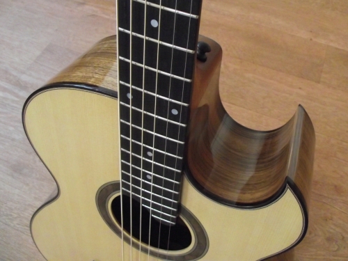 MODEL 1 STEEL STRING GUITARThese guitars are built to my 'model 1' shape. For me, it is the perfect shape: combining elegant “jumbo” style curves with an “OM” size body. The 635mm (25”) scale length makes this a very easy guitar to play. However, if you are a player who uses alternative tunings, this guitar can also be built with a 650mm scale length. This gives more tension in the strings thus accommodating being tuned down. You can see that the Model 1 guitar can be built to your individual requirements; the photos show the “standard” non-cutaway Model and 12 fret neck cutaway and left-handed variants. As with all of my guitars, these are built to the highest standard from fine tonewoods, chosen for their acoustic and aesthetic qualities. | ![]() ![]() ![]() ![]() ![]() ![]() ![]() ![]() ![]() | |||||||